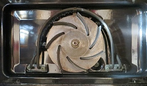 The rear of the oven has a cover, released by 4 screws, which when removed reveals the fan and the near semi-